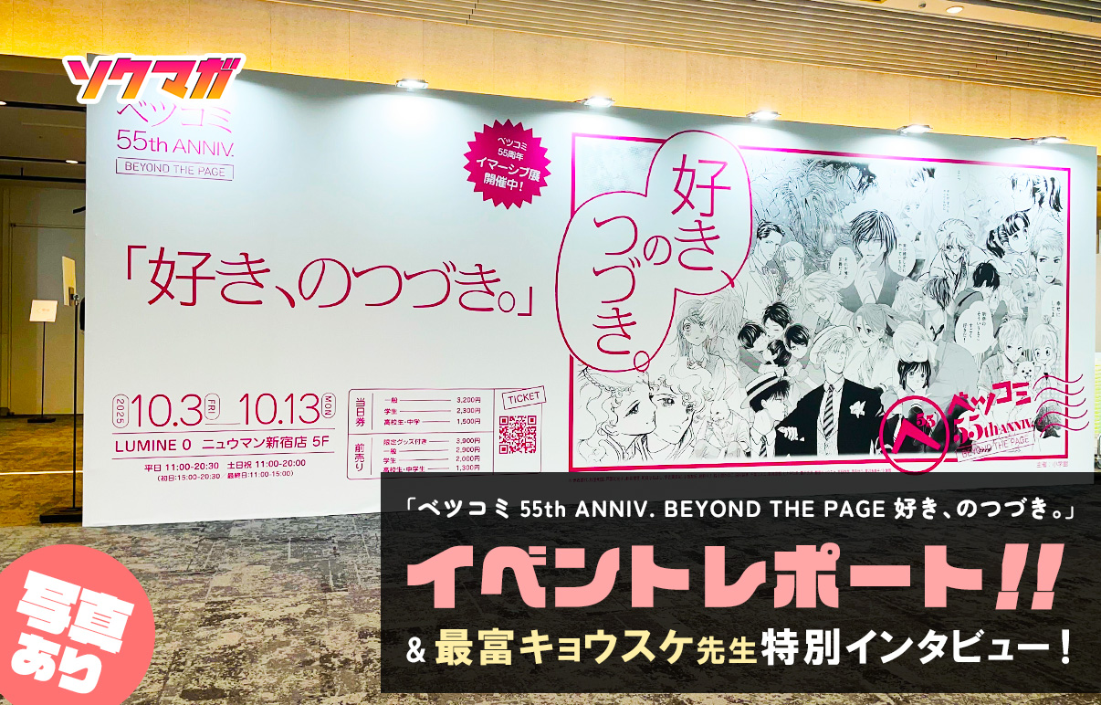 最後に、「来場しようと思っている読者やどうしようかなと思っているファンに向けてメッセージを」という質問に対しては、「かつてのベツコミが好きな方も、今のベツコミが好きな方も55周年の歴史を見て、新しく見ている方は昔のベツコミの作品はこんなに素敵だったんだと思うし、かつてのファンとして来られた方も"今"の作品もフレッシュで面白そうと絶対に思ってもらえるので、幅広くみなさん来ていただいて語っていただきたいなと思います。」と締めくくった。 最富キョウスケ先生、お忙しい中貴重なお話をたくさんありがとうございました! いま迷っている人も、ぜひ「ベツコミ55th ANNIV. BEYOND THE PAGE 好き、のつづき。」に参加してみてはいかがでしょうか。