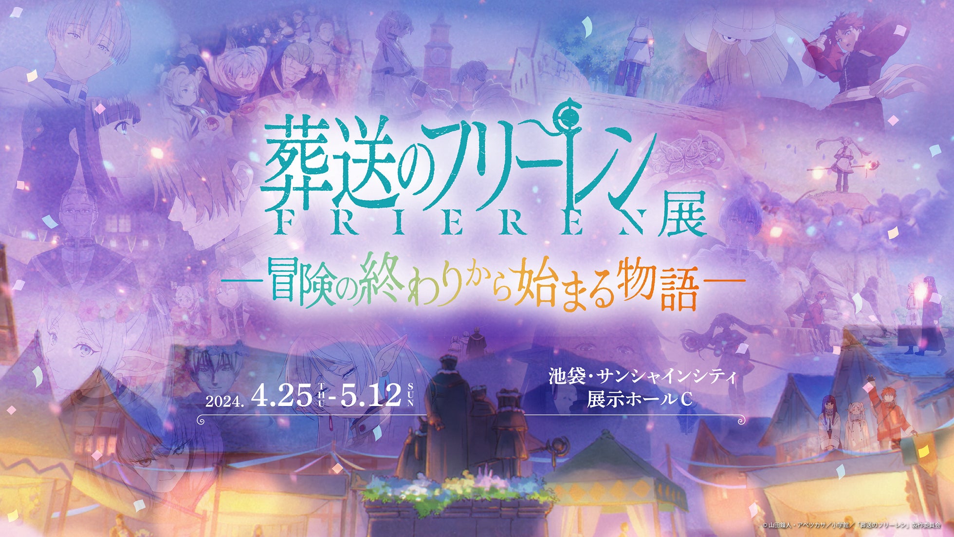 現在毎週金曜よる11時より日本テレビ系全国30局ネットで放送中の大人気TVアニメ『葬送のフリーレン』を題材にした企画展「アニメ 葬送のフリーレン展 ~冒険の終わりから始まる物語~」を、2024年4月25日(木)~5月12日(日)の期間中、池袋・サンシャインシティ 展示ホールCにて開催することが決定しました。 「週刊少年サンデー」(小学館)で連載中、山田鐘人(作)とアベツカサ(画)による漫画『葬送のフリーレン』。勇者とそのパーティーによって魔王が倒された“その後”の世界を舞台に、勇者と共に魔王を打倒した千年以上生きる魔法使い・フリーレンと、彼女が新たに出会う人々の旅路が描かれていく。コミックスは累計発行部数1700万部を突破し、そして2021年には「マンガ大賞2021」大賞、「第25回手塚治虫文化賞」の新生賞、さらに「第69回(2023年度)小学館漫画賞」を受賞するなど、漫画ファンの間で旋風を起こしている本作が、マッドハウスの制作によるアニメとなって2023年9月に放送がスタート! 斎藤圭一郎監督をはじめとする錚々たるスタッフ陣によるハイクオリティなアニメーションが毎週大きな話題を呼んでおり、現在は【一級魔法使い試験編】として、魔法使いたちの戦いとドラマが展開しています。 そんなアニメ『葬送のフリーレン』にて、ファン待望の大型展示イベントがいよいよ開催決定!本展では、名場面を再現した大型展示や、迫力満点の映像演出、大人気キャラクターたちとのフォトスポットなど、『葬送のフリーレン』の世界を様々な角度から楽しむことができるファン必見の内容となっております。 イベントの詳細は後日発表。乞うご期待! イベント公式サイト&公式X開設 本日2024年2月21日(水)に、「アニメ 葬送のフリーレン展 ~冒険の終わりから始まる物語~」の公式サイトならびに公式Xアカウントを開設いたしました。展示内容やオリジナルグッズなど、企画展に関わる様々な情報を発信していきますので、是非ご注目ください! 「アニメ 葬送のフリーレン展 ~冒険の終わりから始まる物語~」開催概要 名称:アニメ 葬送のフリーレン展 ~冒険の終わりから始まる物語~ 場所:池袋・サンシャインシティ 展示ホールC (東京都豊島区東池袋3丁目1−4 サンシャインシティ 文化会館ビル3F) 会期:2024年4月25日(木)~5月12日(日) 主催:「アニメ 葬送のフリーレン展」製作委員会 公式HP:http://frieren-anime-ten.jp 公式X:@frieren_ten ©山田鐘人・アベツカサ/小学館/「葬送のフリーレン」製作委員会
