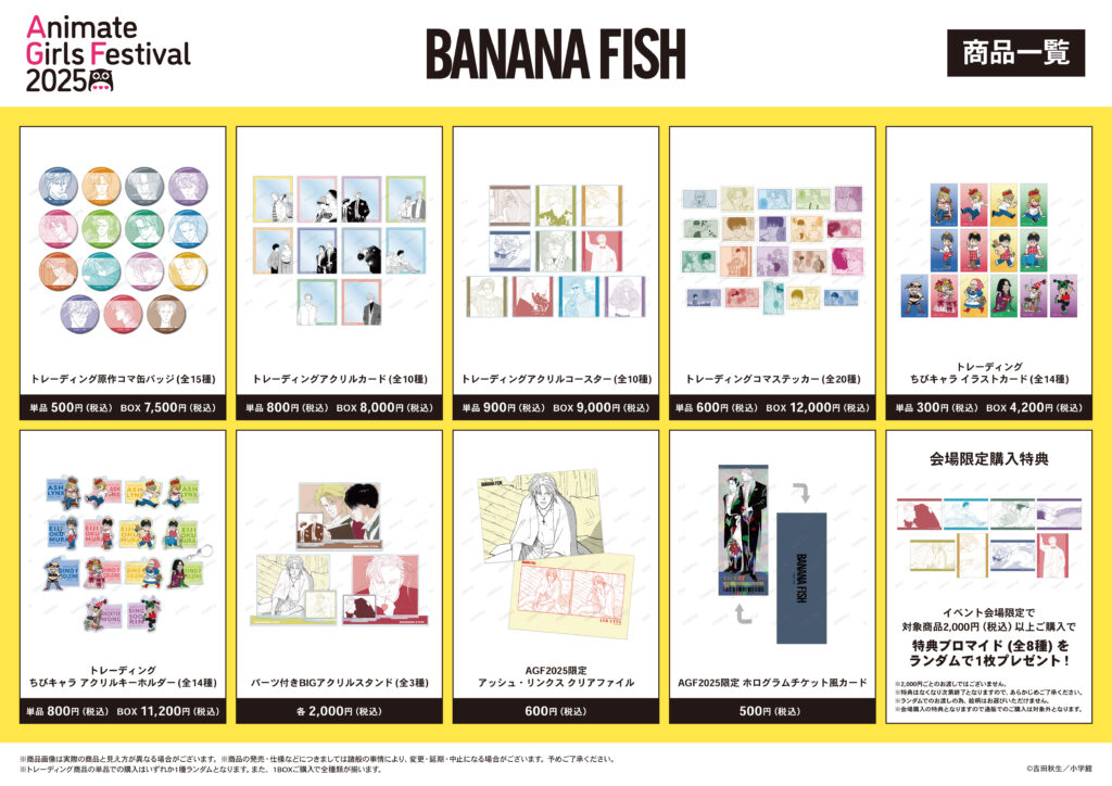 ▼トレーディング原作コマ缶バッジ(全15種) 単品:500円(税込)/BOX:7,500円(税込) ※トレーディング仕様のため絵柄はお選びいただけません。 ※BOX未開封時に限り、1BOXで全種コンプリート出来ます。 ▼トレーディングアクリルカード(全10種) 単品:800円(税込)/BOX:8,000円(税込) ※トレーディング仕様のため絵柄はお選びいただけません。 ※BOX未開封時に限り、1BOXで全種コンプリート出来ます。 ▼トレーディングアクリルコースター(全10種) 単品:900円(税込)/BOX:9,000円(税込) ※トレーディング仕様のため絵柄はお選びいただけません。 ※BOX未開封時に限り、1BOXで全種コンプリート出来ます。 ▼トレーディングコマステッカー(全20種) 単品:600円(税込)/BOX:12,000円(税込) ※トレーディング仕様のため絵柄はお選びいただけません。 ※BOX未開封時に限り、1BOXで全種コンプリート出来ます。 ▼トレーディング ちびキャラ イラストカード (全14種) 単品:300円(税込)/BOX:4,200円(税込) ※トレーディング仕様のため絵柄はお選びいただけません。 ※BOX未開封時に限り、1BOXで全種コンプリート出来ます。 ▼トレーディング ちびキャラ アクリルキーホルダー (全14種) 単品:800円(税込)/BOX:11,200円(税込) ※トレーディング仕様のため絵柄はお選びいただけません。 ※BOX未開封時に限り、1BOXで全種コンプリート出来ます。 ▼パーツ付きBIGアクリルスタンド(全3種) 価格:各2,000円(税込) 【イベント会場限定グッズ情報】 ▼AGF2025限定 アッシュ・リンクス クリアファイル(全1種) 価格:600円(税込) ※アニメイトガールズフェスティバル2025会場限定商品となります。 ▼AGF2025限定 ホログラムチケット風カード(全1種) 価格:500円(税込) ※アニメイトガールズフェスティバル2025会場限定商品となります。 ※画像はイメージです。実際の商品とは異なる場合がございます。 ※物販商品は予定の為、予告なく変更になる可能性がございます。 ※イベント先行販売商品は、本イベントで先行販売される商品です。 ※後日、ECサイト「AMNIBUS」にて取り扱い予定となっております。 また、先行して予約を開始する可能性がございます。 ※アニメイトガールズフェスティバル2025会場限定商品に関しましては、 イベント終了後の販売はございません。 ご了承いただきますようお願いいたします。 ※一部商品につきましては、後日の受注が不可となる場合もございますので、 ご了承いただきますようお願いいたします。 ――――――――――――――― 【会場限定購入特典情報】 イベント会場にて、『BANANA FISH』の関連商品を2,000円(税込)以上ご購入で、「イベント購入特典ブロマイド(全8種)」をランダムで1枚プレゼント!(※2,000円ごとのお渡しではございません。)