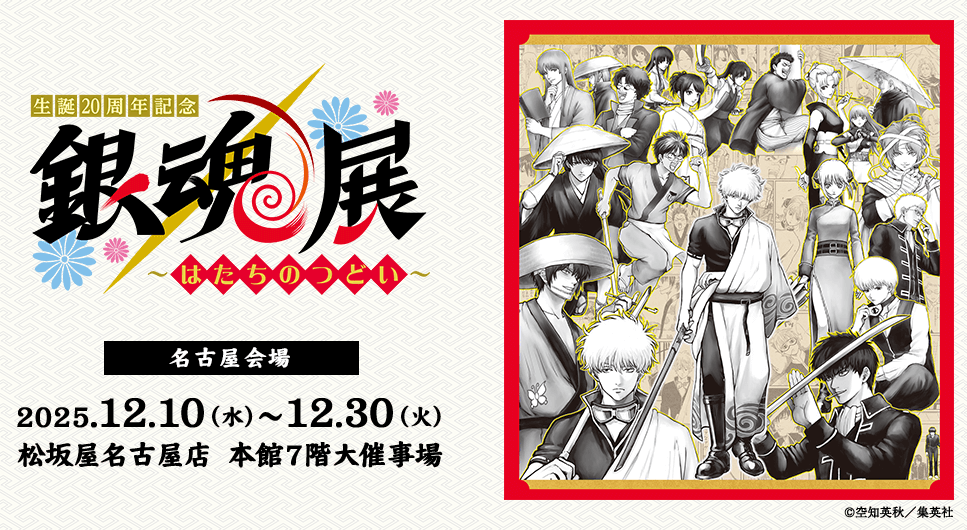 『銀魂』の記念すべき20周年を祝う展覧会として「生誕20周年記念 銀魂展 ~はたちのつどい~」を開催、名古屋会場がいよいよ2025年12月10日(水)より開催される。