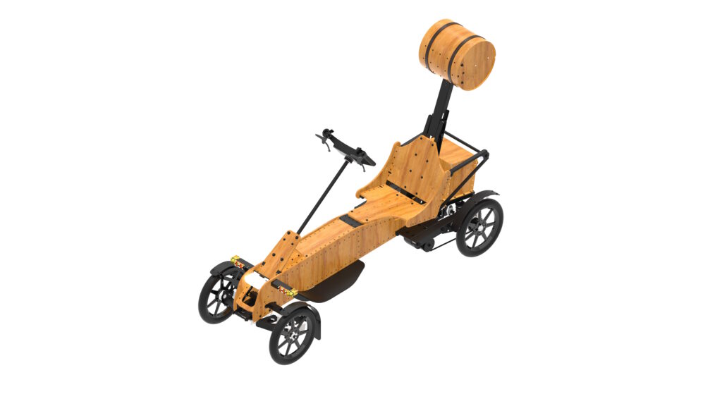 ICOMAチーフエンジニアの水嶋徹が設計した木製カートです。木製カート初の特定小型原動機付自転車区分のため、16歳以上であれば自動車免許がなくても運転でき、最高20km/hでの走行が可能です。