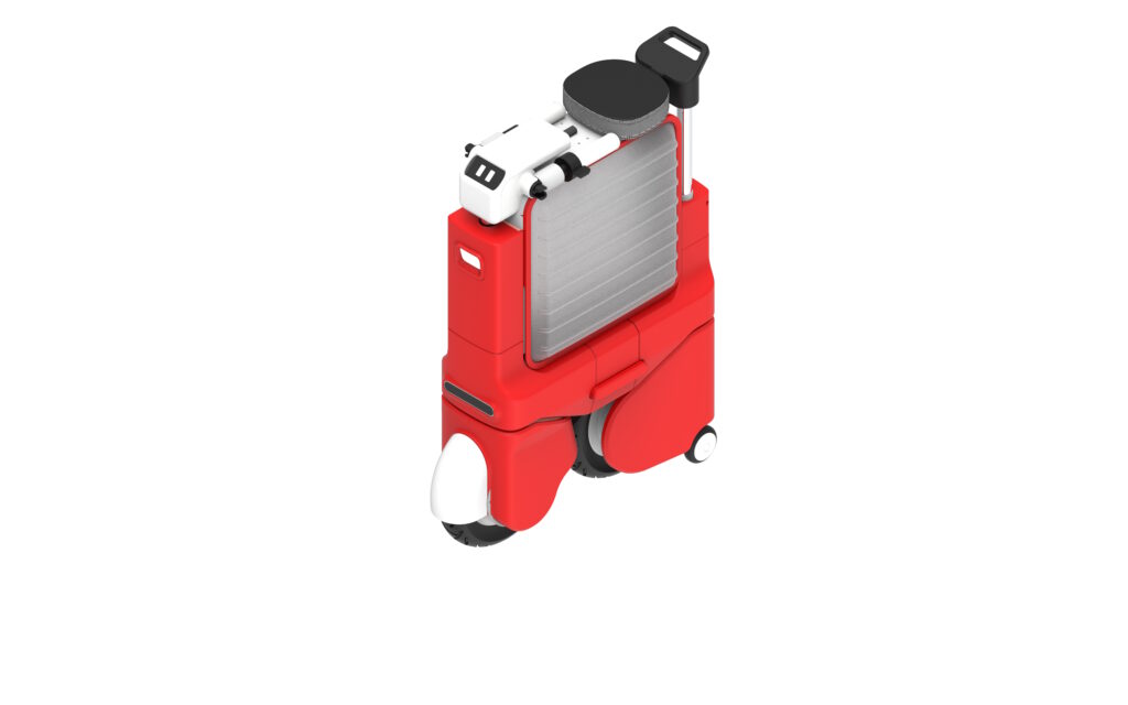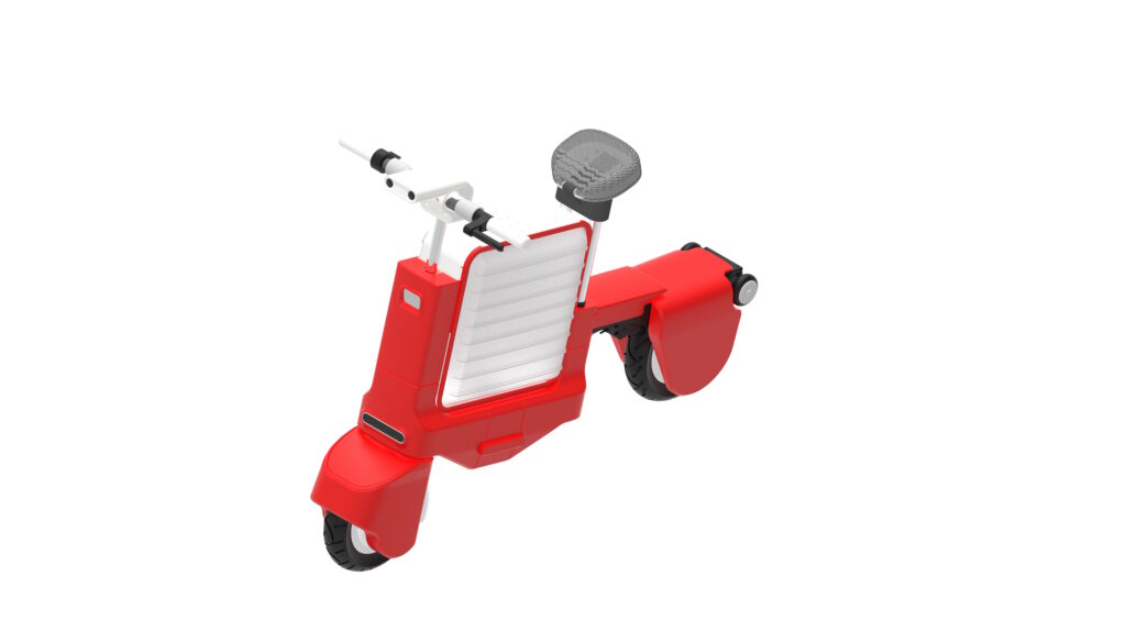 変形するおもちゃから着想を得た折りたたみ電動バイクです。スーツケースのサイズから、フロント10インチ、サスペンション完備の安心して乗車できる小型バイクに変形します。