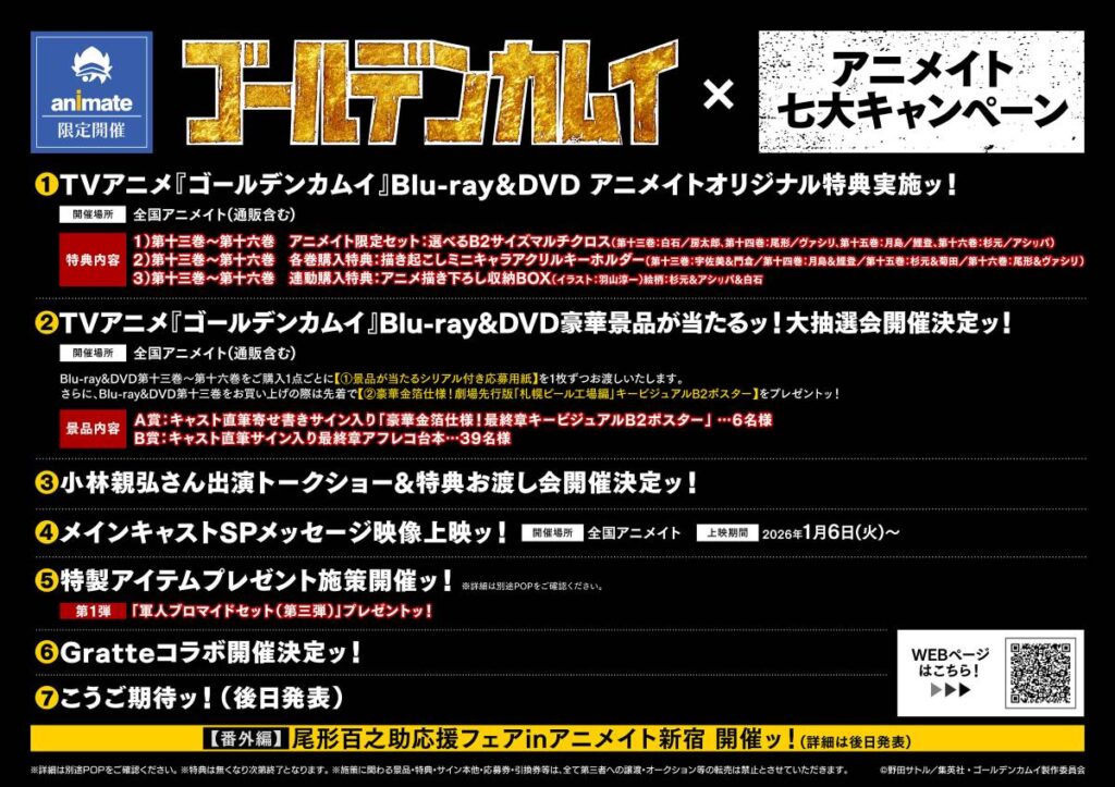 株式会社アニメイトは、TVアニメ『ゴールデンカムイ』最終章の放送開始を記念し、2026年1月から「七大キャンペーン」を開催します。