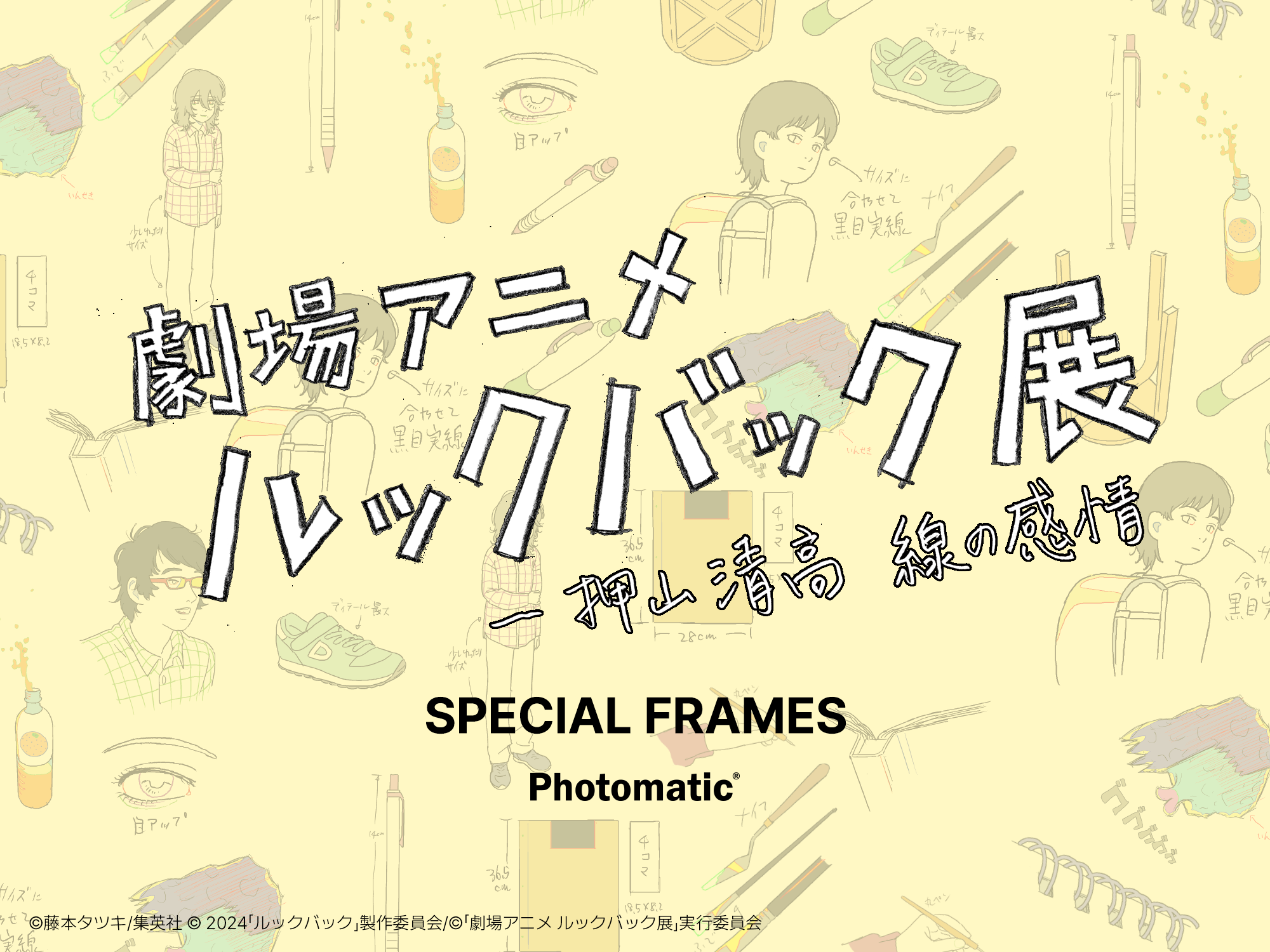 会場に設置されるPhotomaticのフォトブースでは、展覧会のテーマである「線」の魅力を感じられる劇場アニメ『ルックバック』で登場した様々なモチーフをあしらったデザインや、物語の名シーンをフレームに落とし込んだデザインなど、作品の息づかいを感じる全5種のコラボレーションフレームが登場します。