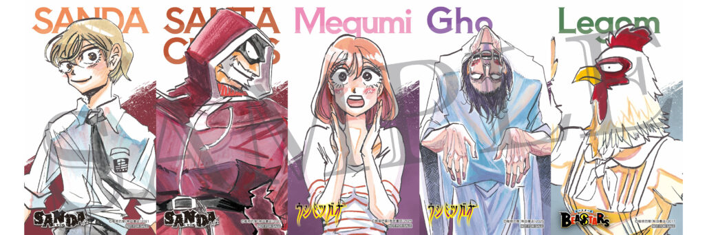 【第2弾】<3月14日(土)~3月20日(金・祝)> 以下の中からランダムで1枚 「SANDA」三田一重、サンタクロース 「ウシミツガオ」恵味、ゴウさん 「BEASTARS」レゴム(板垣巴留先生)