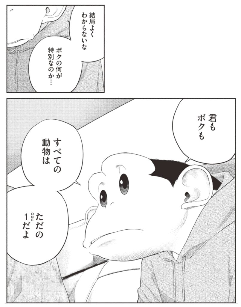 ▶チャーリーが世界の見方を一言で表現した1巻の一コマ。「すべての動物は ただのONEだよ」 『ヒトとサルの境界線』に収録した境界線を探す問答は、そんな『ダーウィン事変』の物語をきっかけに始まりました。