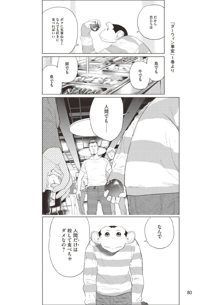 ◀パブリックドメインとして公開され、世界的な話題を集めた『ダーウィン事変』1巻からの一コマ。主人公の〝ヒューマンジー〟チャーリーの真っ直ぐな問いかけが、平和ボケした常識を撃ち抜いた。