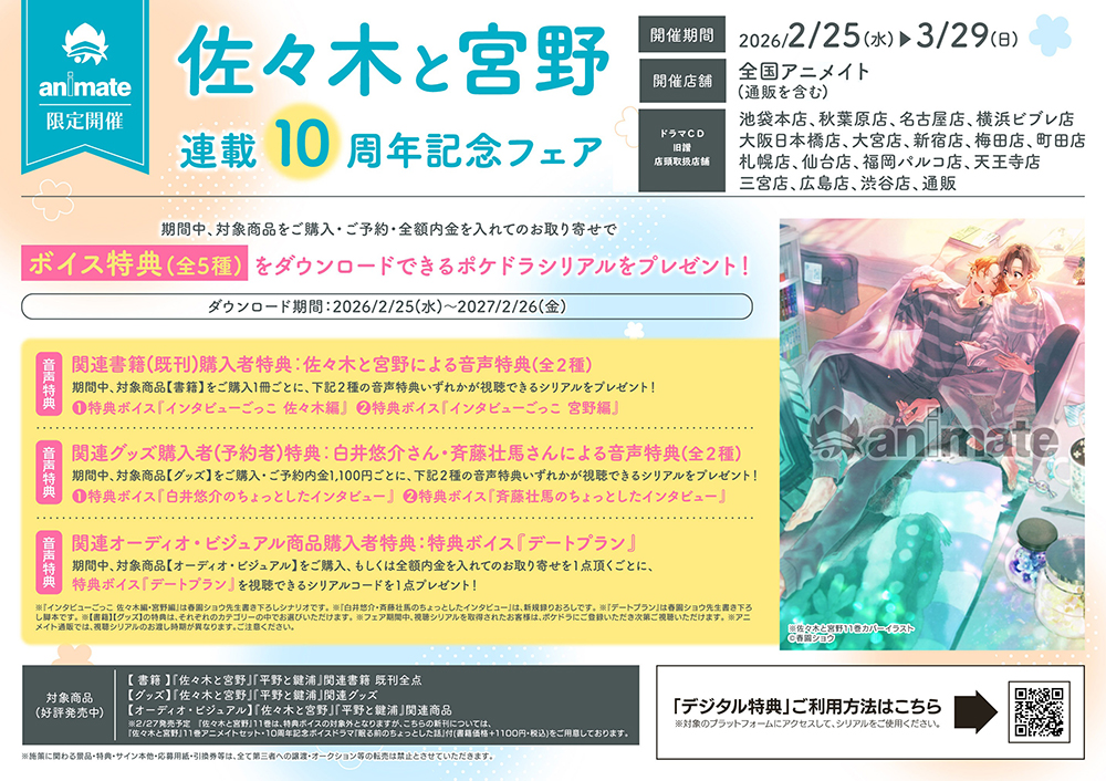 『佐々木と宮野』連載10周年記念フェア 開催期間:2026年2月25日~3月29日 開催場所:全国アニメイト(通販含む) 開催内容:期間中、『佐々木と宮野』『平野と鍵浦』関連商品をご購入・ご予約いただいた方に、各商品に対応したボイス特典(全6種)をダウンロードできるポケドラシリアルをプレゼントいたします。 特典内容: <書籍(既刊)>※ボイスはお選びいただけます ・特典ボイス「インタビューごっこ 佐々木編」 ・特典ボイス「インタビューごっこ 宮野編」 <関連キャラクターグッズ>※ボイスはお選びいただけます ・特典ボイス「白井悠介のちょっとしたインタビュー」 ・特典ボイス「斉藤壮馬のちょっとしたインタビュー」 <オーディオ・ビジュアル商品> ・専用特典ボイス「デートプラン」 <ぱしゃこれ第二弾(2026年10月発売)> ・専用特典ボイス「ぱーしゃーこーれっ」 ボイスダウンロード期間:2026年2月25日~2027年2月26日 ※各商品の特典付与条件は、フェアページをご確認ください。