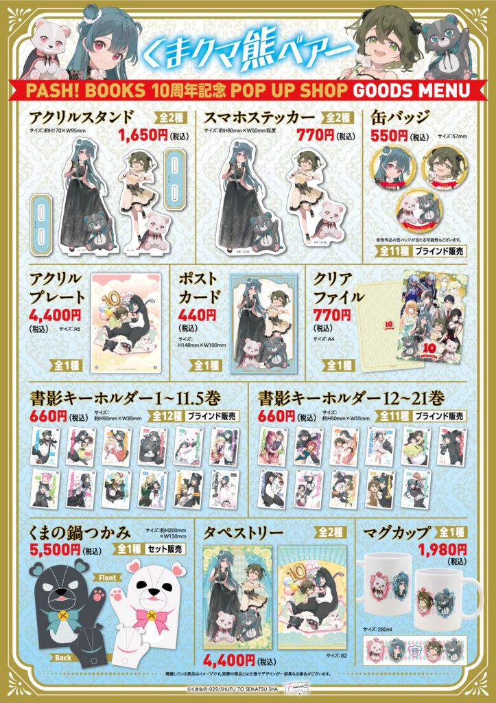 創刊10周年を記念した豪華5作品「くまクマ熊ベアー」「え、社内システム全てワンオペしている私を解雇ですか?」「婚約破棄された令嬢を拾った俺が、イケナイことを教え込む 」「王太子に婚約破棄されたので、もうバカのふりはやめようと思います」「私の心はおじさんである」による、オリジナル描き下ろしを起用したグッズの販売を始め、著者・イラストレーターのサイン入り色紙やアクリルプレートのプレゼント企画も行います。また、レジにて1会計3,000円(税込)毎のご購入で、購入特典「クリアしおり」(※無くなり次第終了)のプレゼントも実施します。その他、等身大アクリルパネルの実施やメッセージボードの設置等の店舗限定企画も盛りだくさんのイベントとなっております。