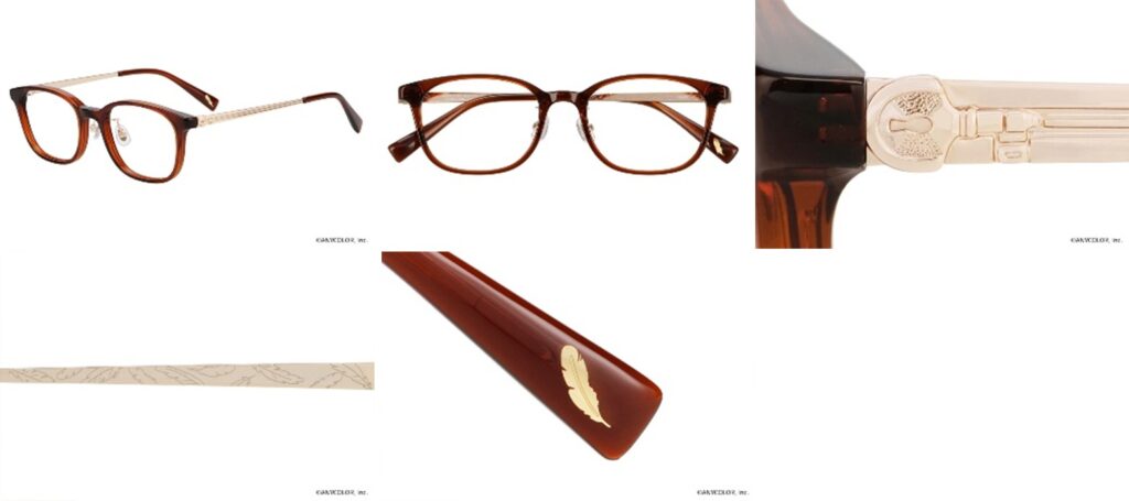 ローレン・イロアスが身に着けているネックレスの鍵を、テンプルにメタルパーツで再現。テンプルに施した2本ラインは、彼の衣装をイメージ。テンプルエンドのインレットとテンプル裏側には、モチーフである羽をあしらいました。サングラスのカラーレンズには、メガネのモデルに合わせたこだわりのカラーを採用!