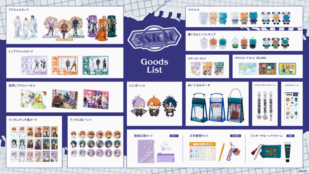 VTuberグループ「にじさんじ」所属の北見遊征、魁星、榊ネスの3名によるユニット「3SKM」の活動2周年を記念したグッズが登場! グッズラインナップは、アクリルスタンド、ミニアクリルスタンドセット、箔押しアクリルパネル、ポストカードセット、ランダムチェキ風カード、ランダム缶バッジ、ステッカーセット、メタリックネームチャーム、ぬいぐるみポーチ、にじぱぺっと、ぷにぷにシール、着ぐるみミニフィギュア、マスコット他、3SKMメンバーそれぞれの個別グッズを含む全16種類。