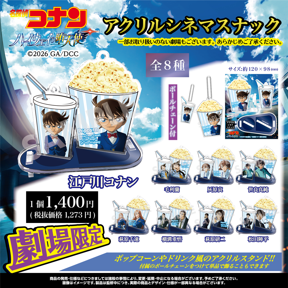 アニメ・キャラクター雑貨およびオリジナル商品の企画、デザイン、製造販売を行うゼロジーアクト株式会社(本社:東京都台東区 ※朝日放送グループ)は、劇場版『名探偵コナン ハイウェイの堕天使』のアクリルシネマスナックを発売いたします。 なお、映画公開日頃に各劇場での取り扱いを予定していますが、各劇場の売場状況により発売日が前後する場合がございますので、予めご了承ください。また、本商品はゼロジーアクトオンラインストアでの取り扱いはございません。